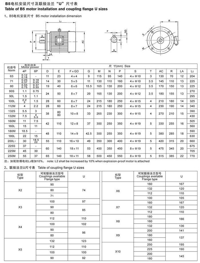 X/B系列擺線針輪減速機電機安裝尺寸表
