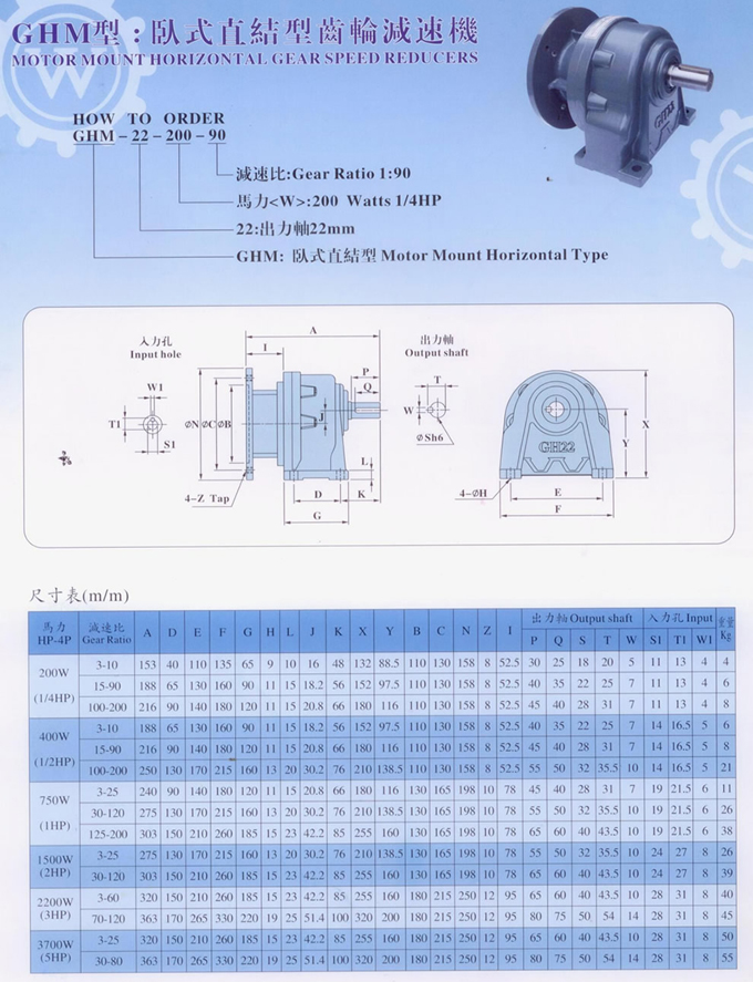 GHM臥式齒輪減速電機的型號表示方式,GHM臥式小齒輪減速機馬達的外形尺寸表,GHM18,GHM22,GHM32,GHM40,GHM50;75W(1/10HP),100W(1/8HP),200W(1/8HP),400W(1/2HP),750W(1HP),1500W(2HP),2200W(3HP),3700W(5HP)