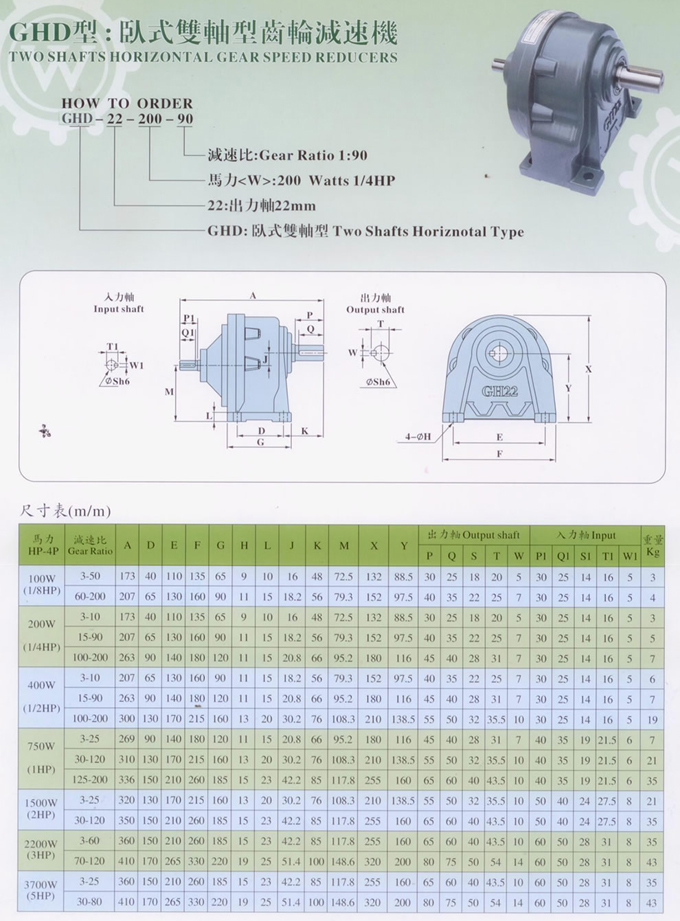 GHD臥式齒輪減速電機的型號表示方式,GHD臥式小齒輪減速機馬達的外形尺寸表,GHD18,GHD22,GHD28,GHD32,GHD40,GHD50;75W(1/10HP),100W(1/8HP),200W(1/4HP),400W(1/2HP),750W(1HP),1500W(2HP),2200W(3HP),3700W(5HP)